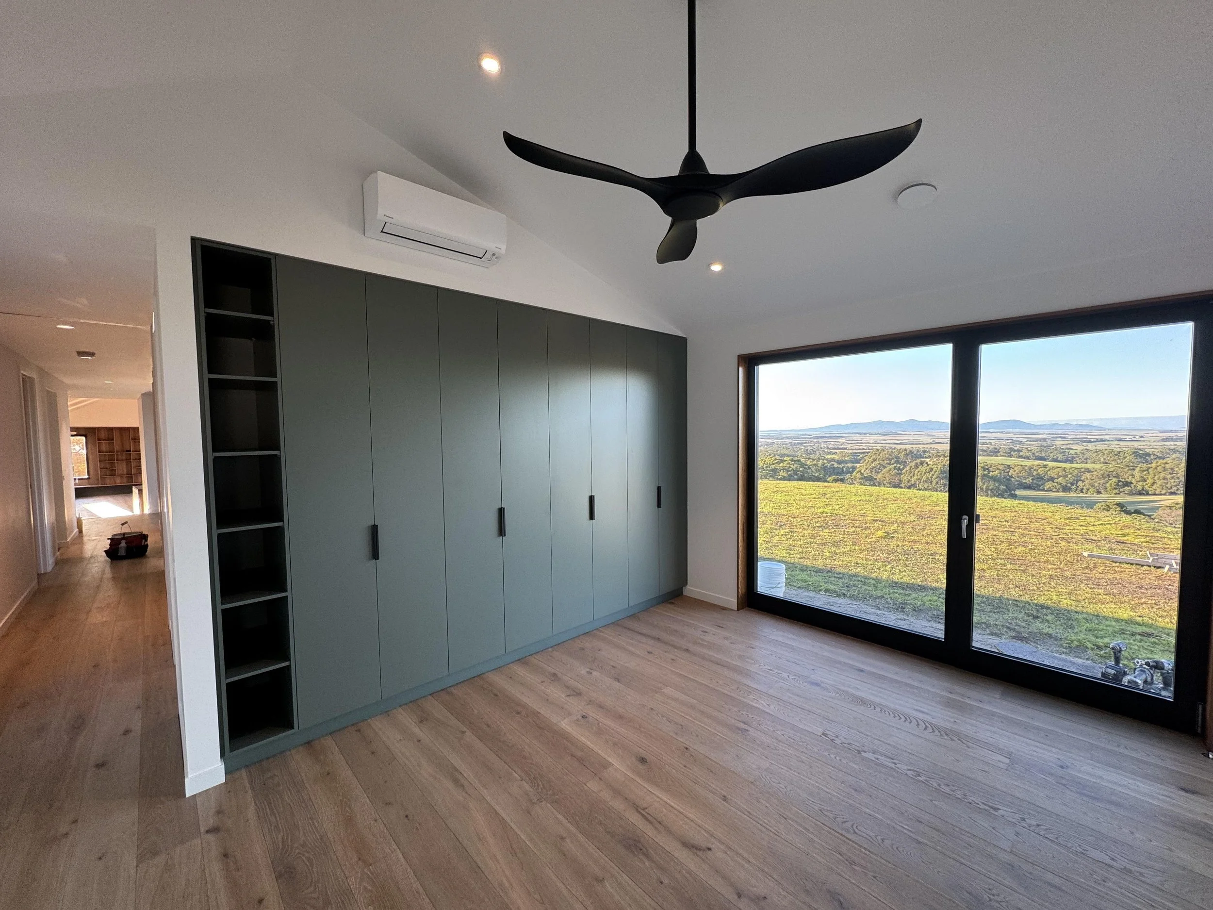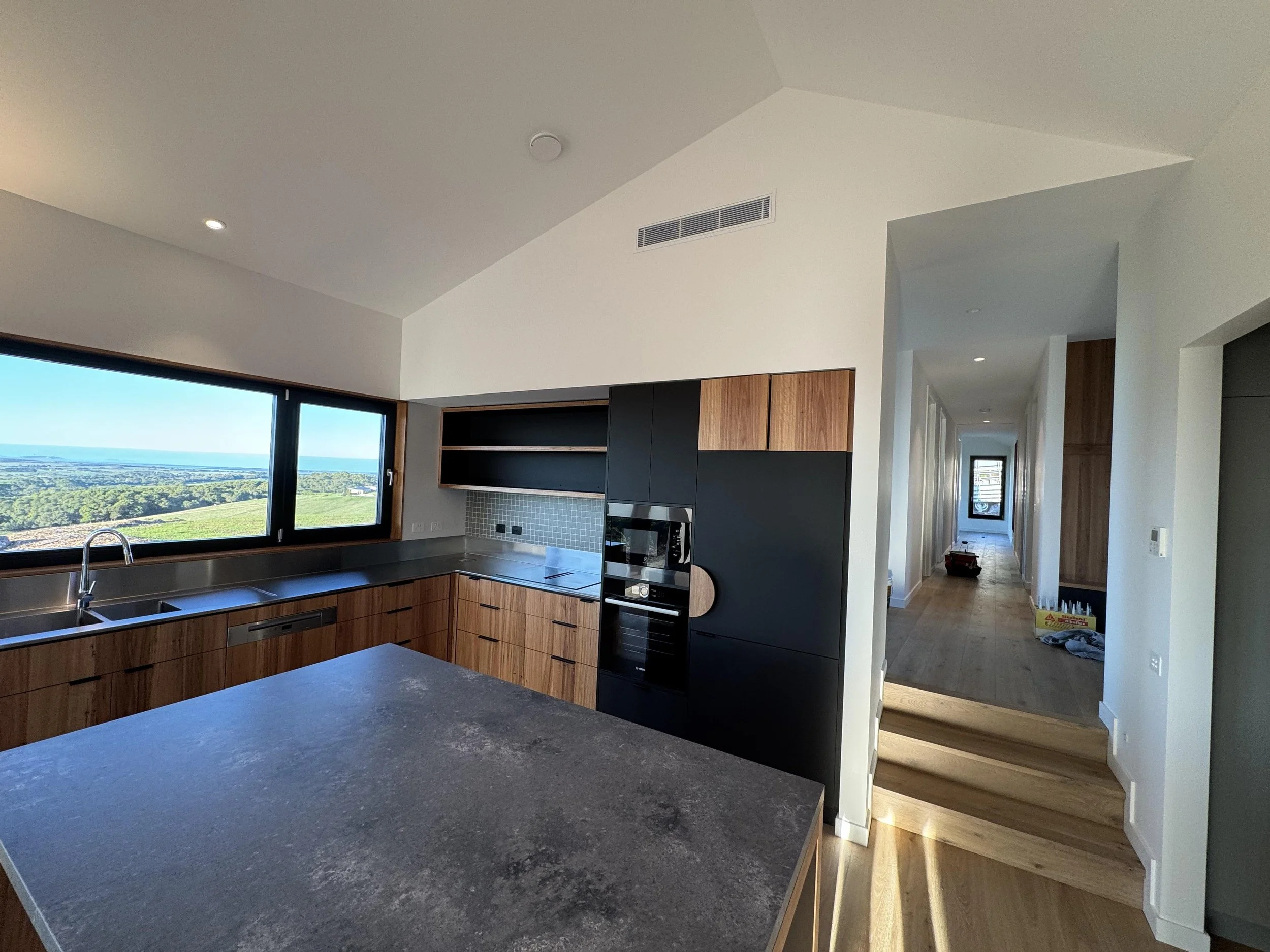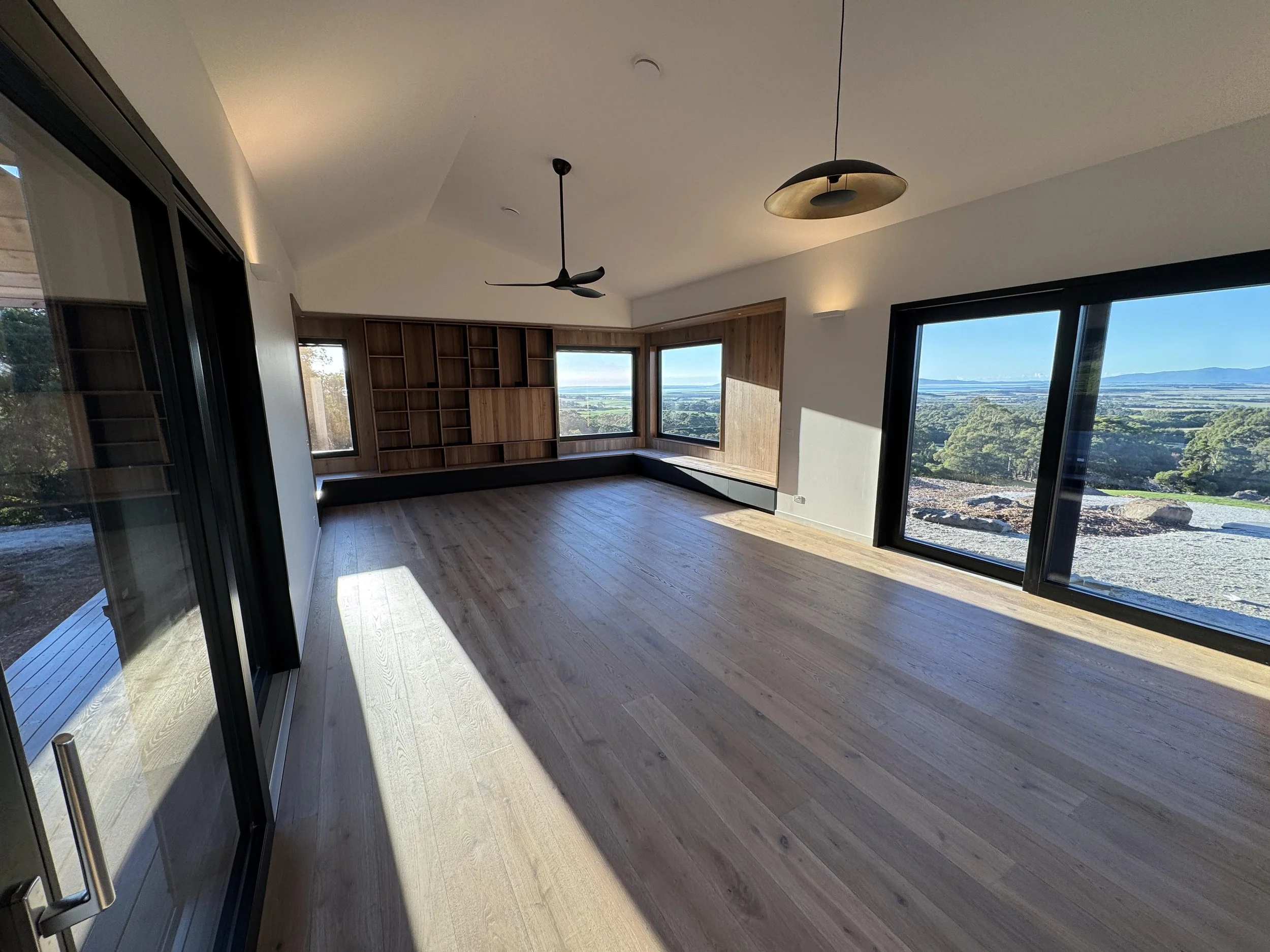 Perched high with sweeping, unobstructed views of Wilson’s Promontory National Park, this beautifully designed 3-bedroom certified Passivhaus combines modern energy-efficient living with striking aesthetics. The home features durable galvanised corrugated iron cladding, complemented by a truly unique, hand-painted mural that artfully covers both the roof and the exterior walls, creating a seamless blend of functionality and artistic expression.
